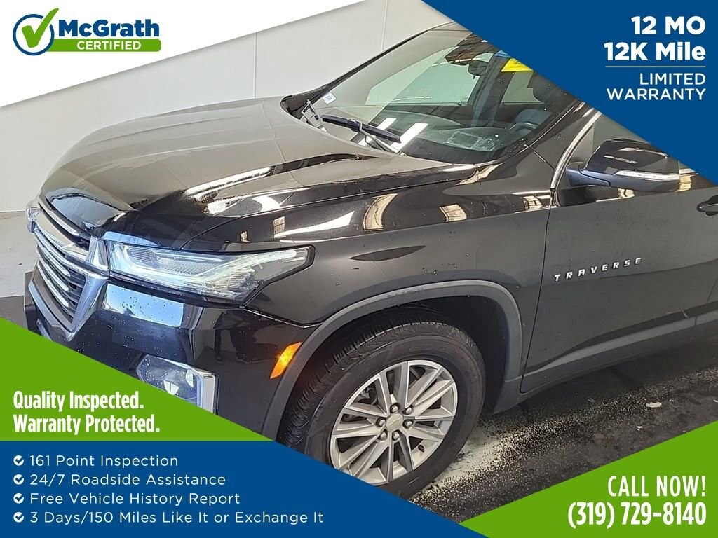 18/27 City/Highway MPG Priced below KBB Fair Purchase Price!Certification Program Details: McGrath Certified Benefits: * Free Vehicle History Report * 106 Point Full Vehicle Condition Inspection * Like it or Exchange it! Three Day Policy 2023 Chevrolet Traverse LT 1LT 3.6L V6 SIDI VVT FWDWe're in the customer service business first, the car business second.- H.B. McGrath. Our goal is to offer our customers great vehicles at unmatched prices, but the car business isn't just about the product, it's about the people. Welcome to McGrath, your destination for award-winning automotive excellence! Wwe were voted CBJ's 2024 #1 Coolest Place to Work and winner of 2024 Best of the Best Auto Dealer, Auto Service, and Fleet Dealer. We’re proud to deliver unmatched quality and service. With over 11,000 5-star Google reviews, our customers’ trust and satisfaction drive everything we do. Whether you’re buying, servicing, or building your fleet, experience why McGrath is the top choice for all your automotive needs! If we aren't making our customers happy, we aren't in business. It's as simple as that, and we intend to deliver on the promise: Get More with McGrath.Prices may change at any time and are subject to availability and prior sale. Taxes, title, license fees, and a $180 documentation fee are not included. Pricing reflects all applicable rebates and incentives assigned to the dealer. Example payments are estimates; actual terms vary based on credit approval. APR and payment estimates apply to qualified buyers, not all buyers qualify for advertised rates. Factory cash incentives may not be combined with promotional APR. Fuel economy ratings and driving range figures are based on EPA estimates for new vehicles, and actual mileage and range may vary. Some in-stock vehicles may include a $1,295 Clear Guard Protection package By submitting your phone number online, you consent to occasional SMS or voice calls about our products and promotions; standard messaging rates may apply. Consult dealer for offer eligibility and other details. Factory MSRP is not the final advertised/asking price of the vehicle. Fuel economy figures are official EPA estimates and clearly labeled as such.